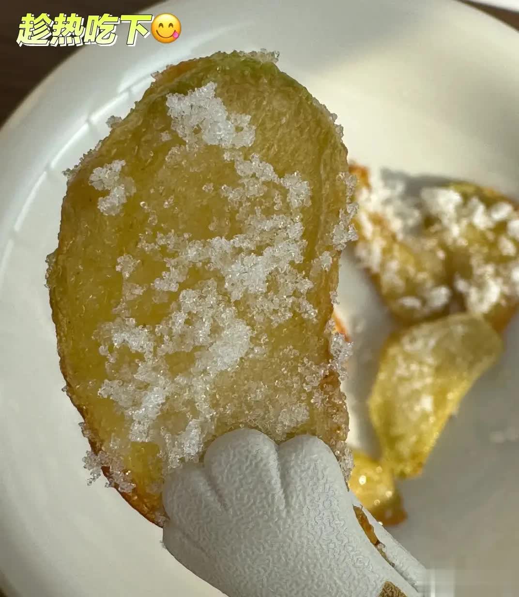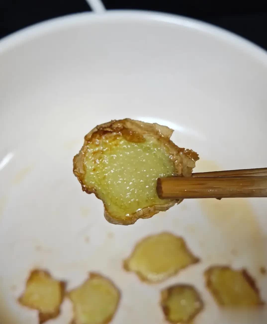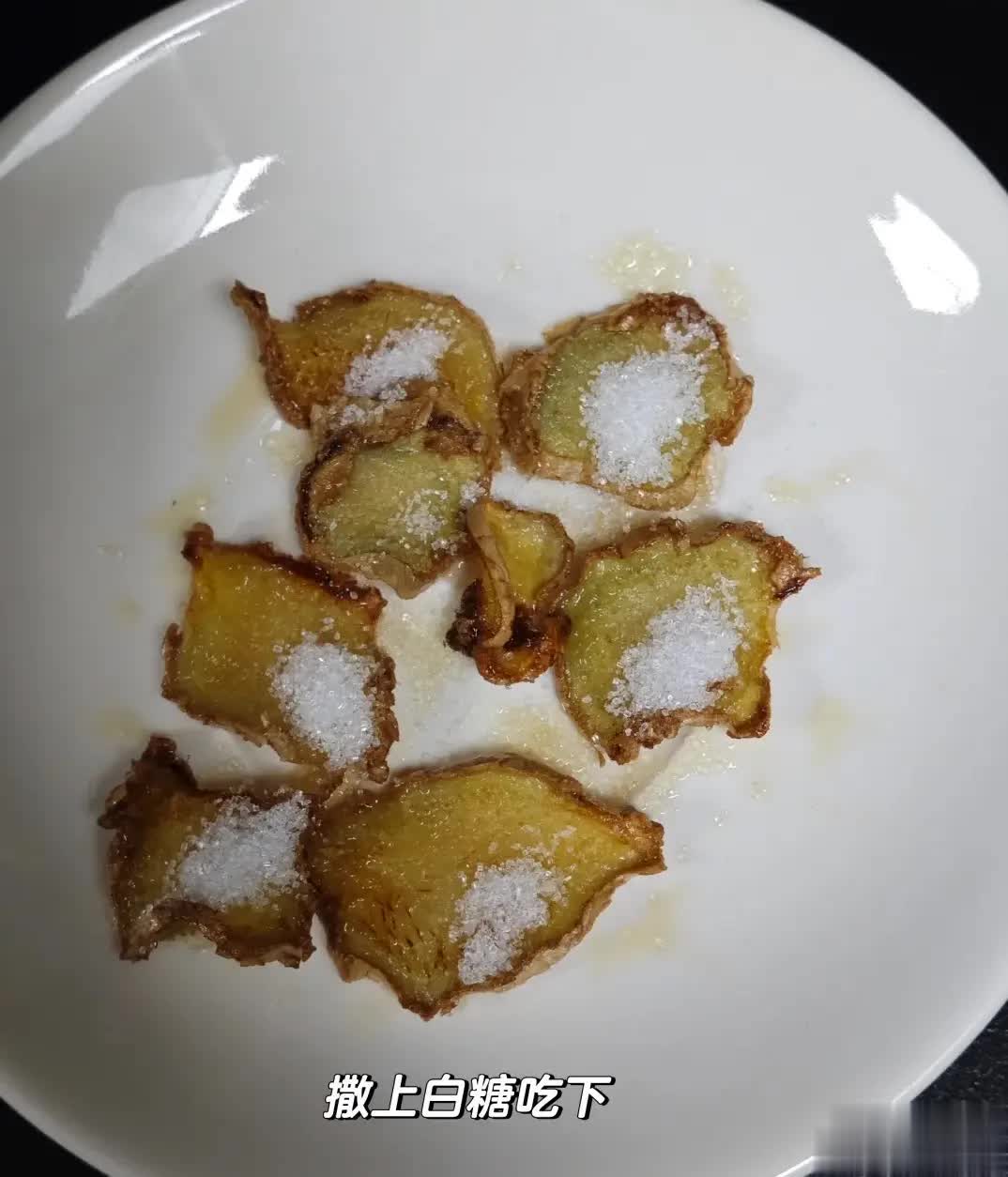 2.姜片炸好后呀,把它们捞出来,放在盘子里,再撒上一点白糖,然后让咳嗽的人一次把这姜片都吃下去哦。要是有人不喜欢这个味道呀,也没关系,还可以用炸完姜片剩下的油煎个鸡蛋吃,效果也是一样好的哦。