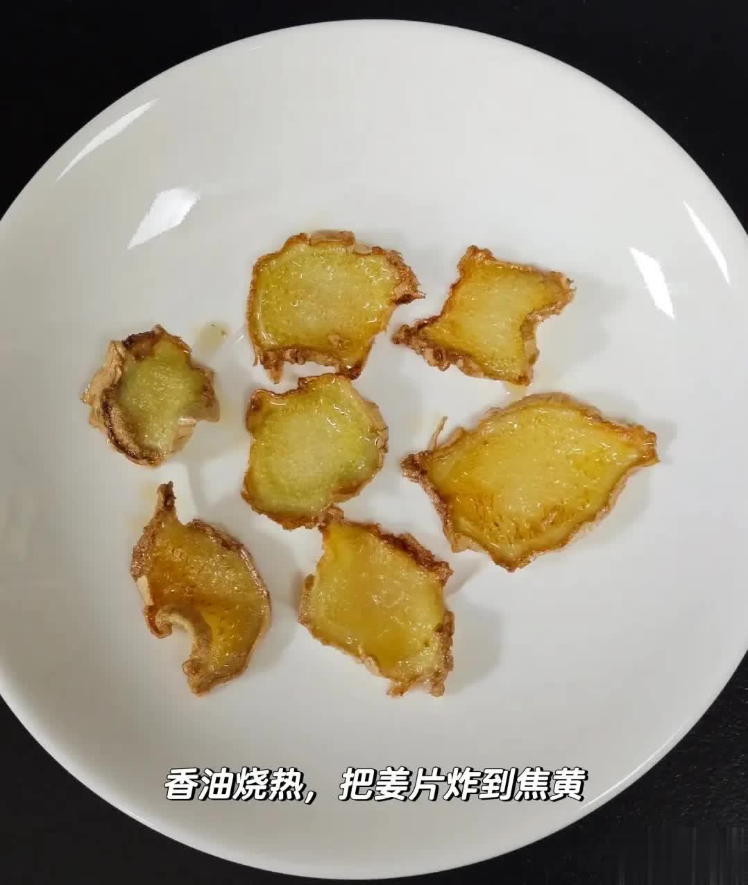 1.先把姜切成片,然后在锅里倒上香油哦,记住啦,得是香油才行(香油就是麻油),其他油可没这个效果呢。开小火,把姜片放进去慢慢炸,炸到姜片变得金黄了,这时候就差不多啦。